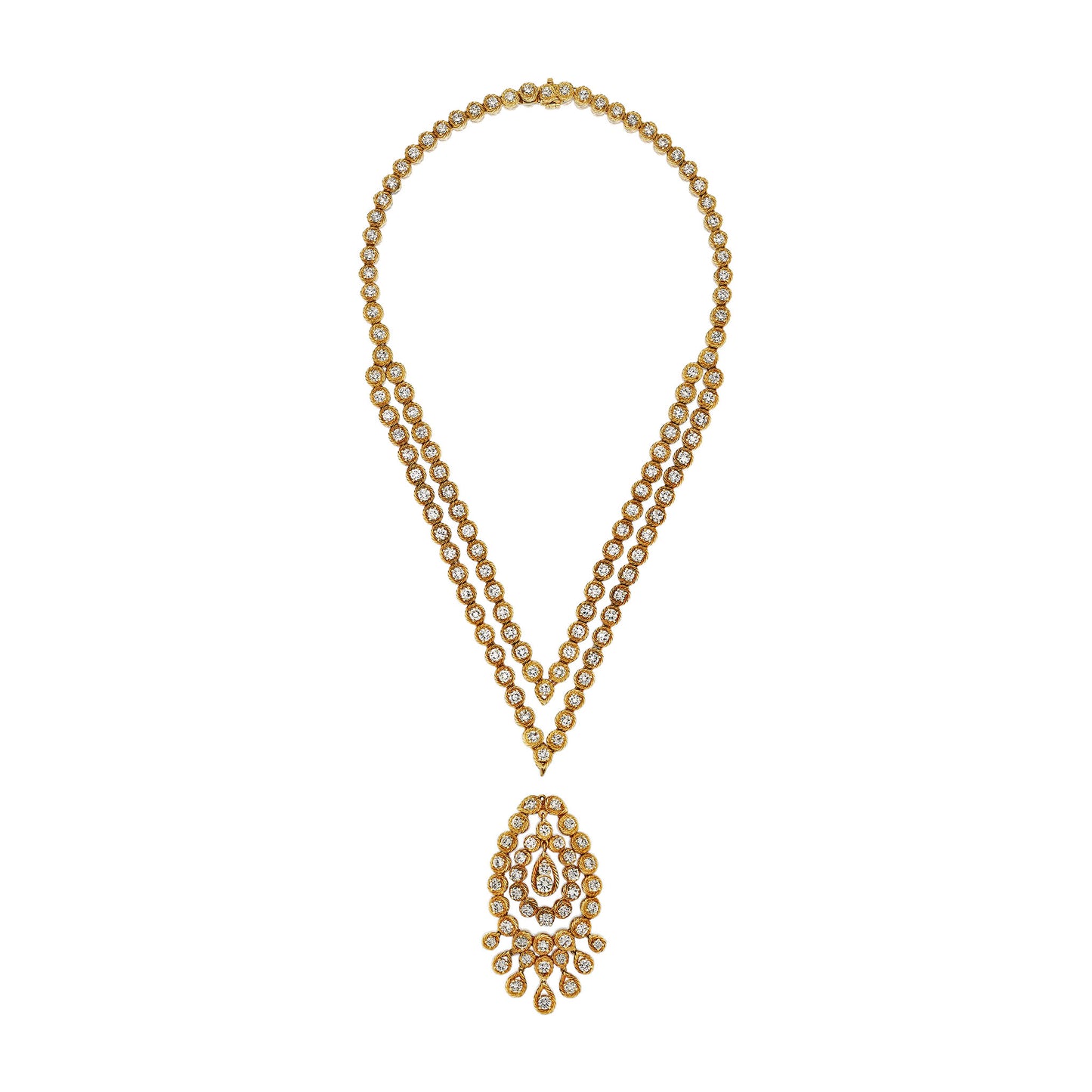 Materials: Necklace: 152 round brilliant-cut diamonds (approximate total weight 23.00 carats); Pendant Earrings: 82 round brilliant-cut diamonds (approximate total weight 8.30 carats); 18K gold