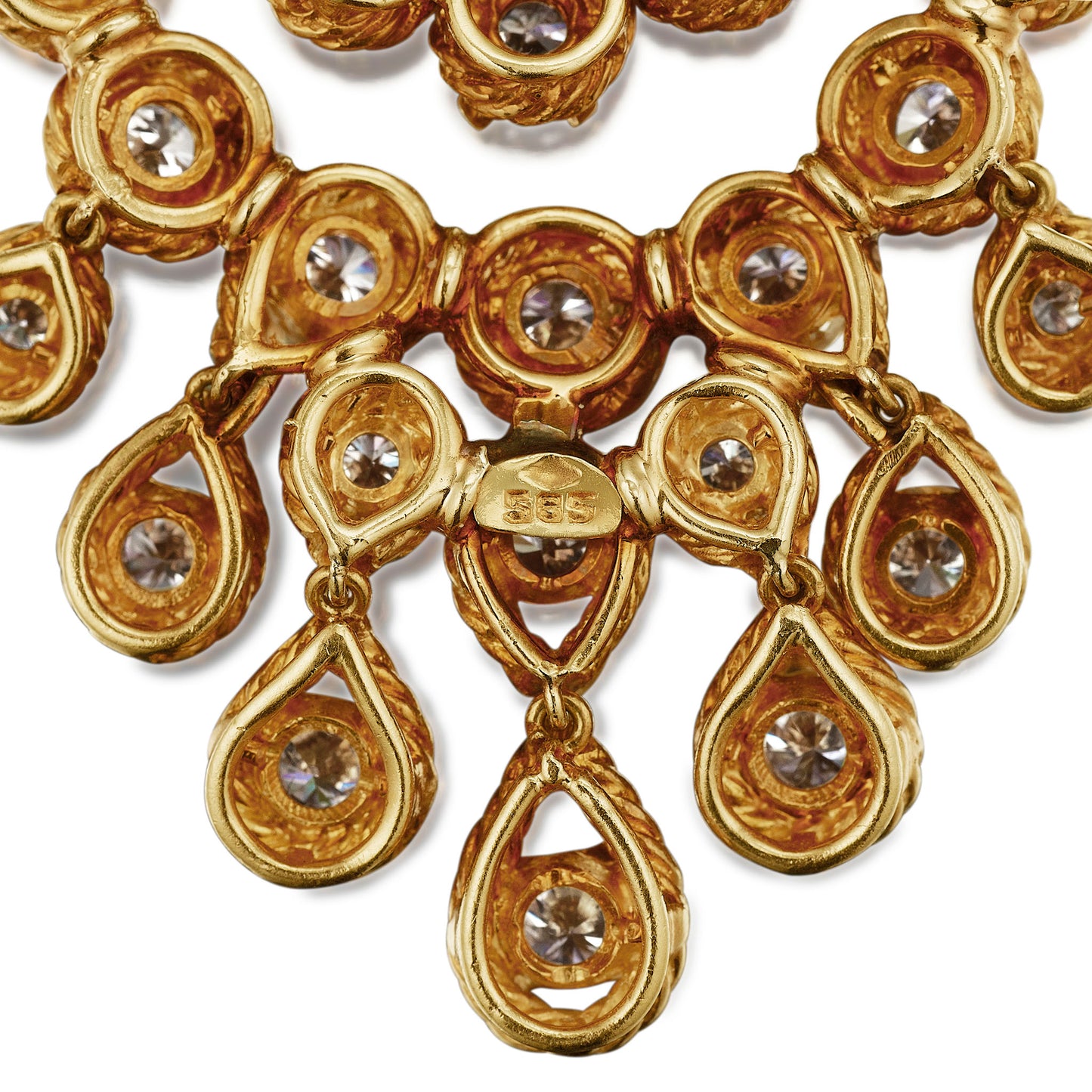 Designed in the 1960s, this convertible 18K gold and diamond suite by Van Cleef & Arpels comprises a pendant necklace and day/night earrings. The 18K gold ropework necklace with detachable pendant is designed as a single dividing to double-stranded diamond rivière, sweeping to a delicate point in the center, and suspending a detachable leaf-form pendant with a flexible fringe, set throughout with round brilliant-cut diamonds. The ensuite 18K gold ropework and diamond day/night pendant earrings are each designed as an oval top suspending flexibly-mounted detachable leaf-form pendants. Beautifully-made, softly flexible, and versatile, this opulent Van Cleef & Arpels suite derives inspiration from the forms and sacred materials of India, where precious gems, gold and spirituality have synthesized to create thousands of years of jewelry art.