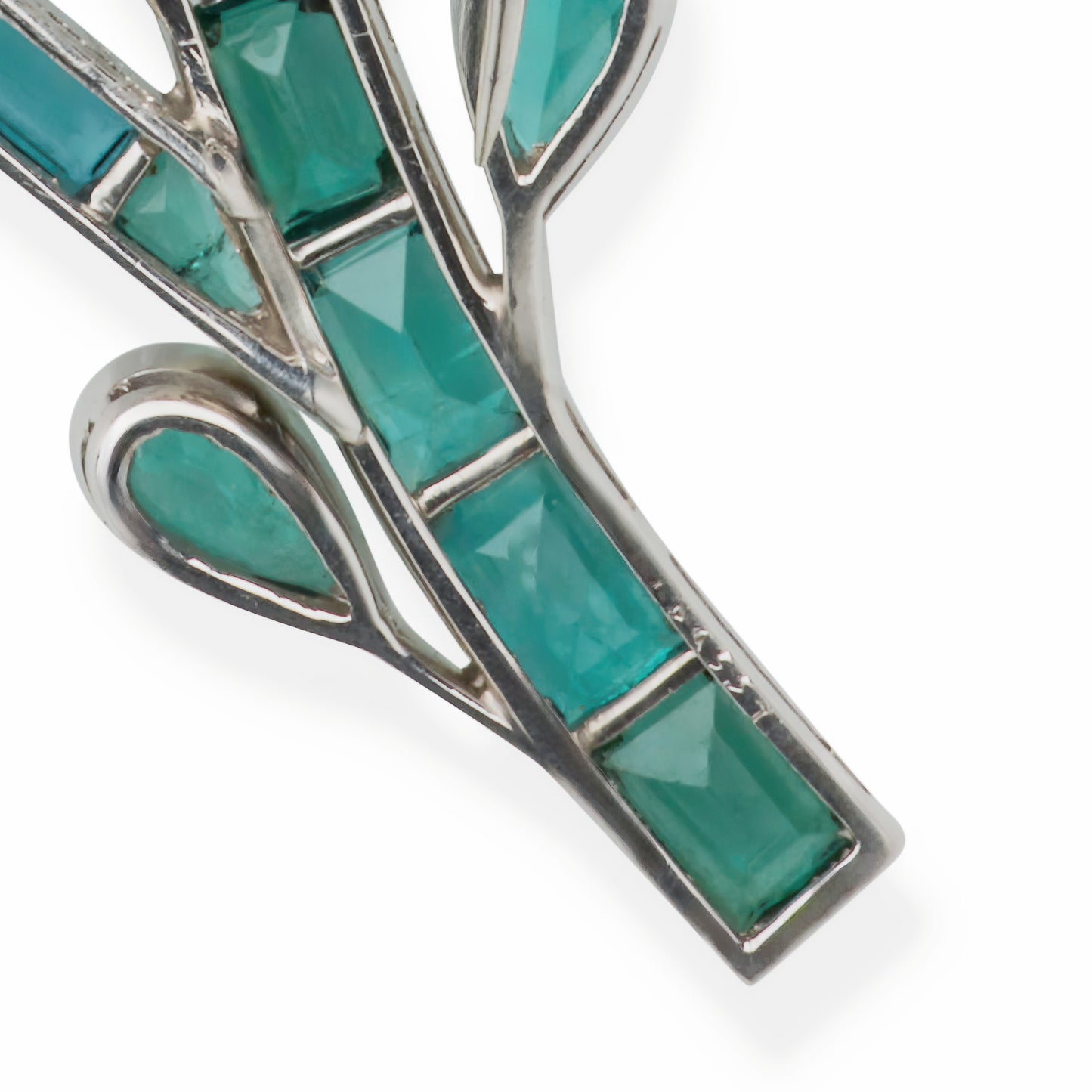 Materials: 64 circular-cut spessartite garnets; 25 baguette-cut pink topaz; 22 French-cut, 5 pear-shape, 11 baguette, and three calibré-cut green tourmalines; 1 pentagonal pink tourmaline; Platinum