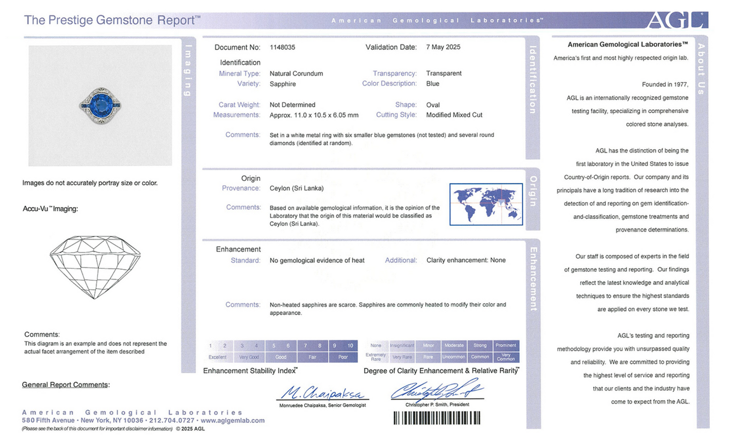 Documentation: Accompanied by AGL report no. 1140773 dated 2 July 2024 stating that the sapphire is of Ceylon origin, with no evidence of heat.